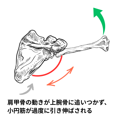 そのため肩を持ち上げようとしても、小円筋が引き延ばされてしまい、