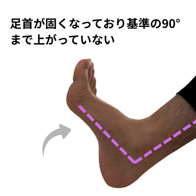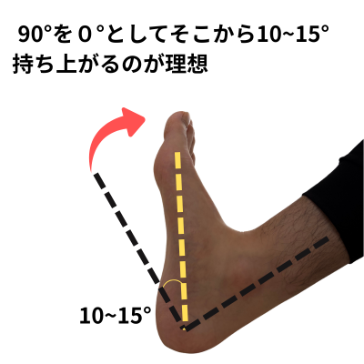 本来、足首は90度直角からさらに10度から15度ほど持ち上がるところが理想とされています。